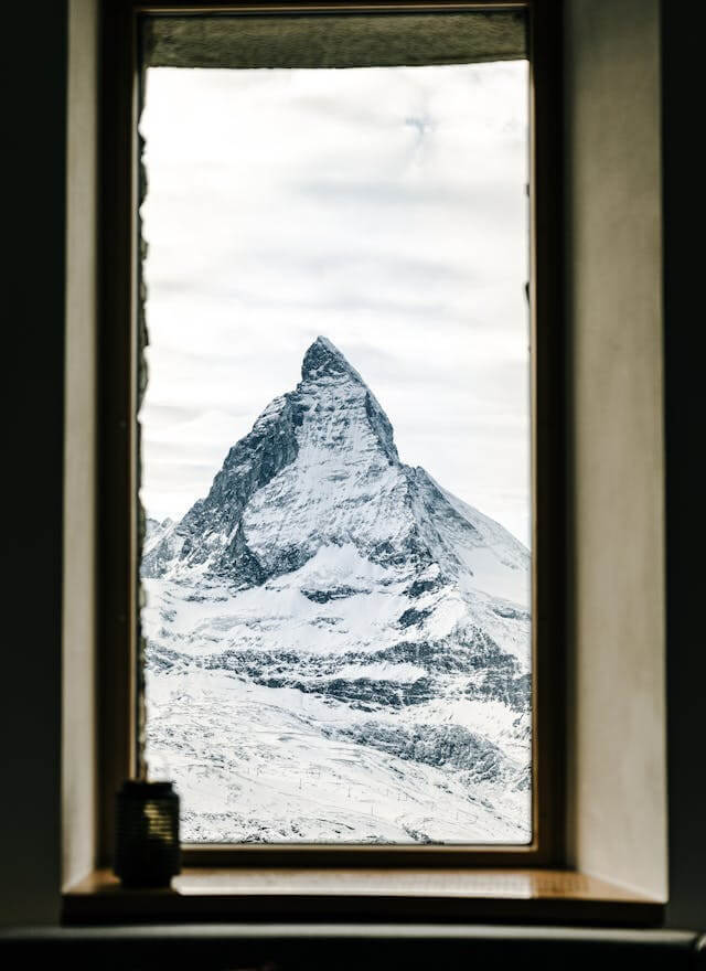This example removes the surrounding padding from a photo taken through a window. It adjusts the cropping area to exclude the window frame and keep only the view outside. The result is a simpler image focused entirely on the mountains and sky. (Source: Pexels.)